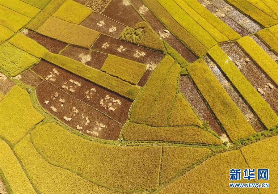 这是广南县八宝镇坝龙村的稻田景色(9月20日无人机拍摄)。 云南省文山壮族苗族自治州广南县八宝镇今年种植优质水稻22000余亩,秋收季节,田野里一片金黄,景色如画。 新华社记者杨宗友摄