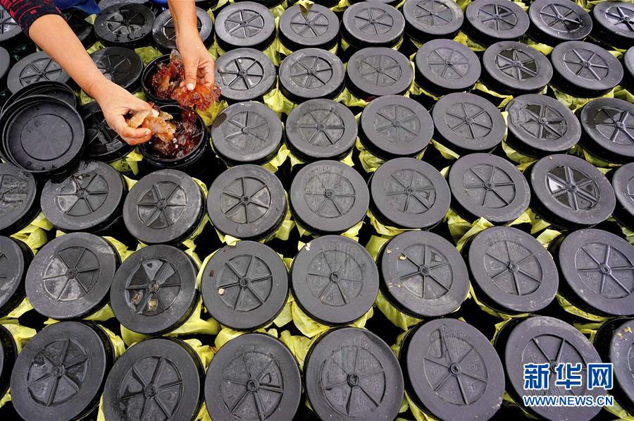 9月21日,滦南县南堡镇南堡二村一家海蜇养殖场的工人在展示卤制好的海蜇头。新华社记者杨世尧摄