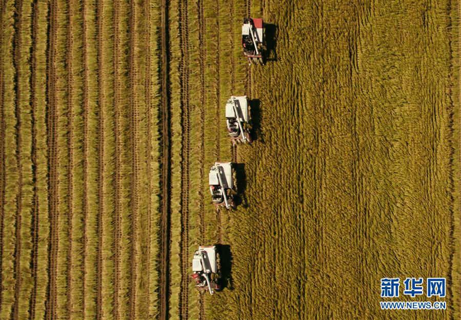 在吉林省吉林市万昌镇,农民在张楠楠成立的家庭农场的稻田间驾驶收割机收割水稻(9月18日摄)。 新华社记者 许畅 摄