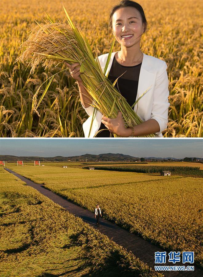 这张拼版照片显示的是:上图,9月19日,在吉林省舒兰市白旗镇松江村,返乡创业成立有机水稻合作社的蔡雪在稻田间捧着刚收割的早稻;下图,9月19日,蔡雪行走在稻田间的栈道上(无人机拍摄)。