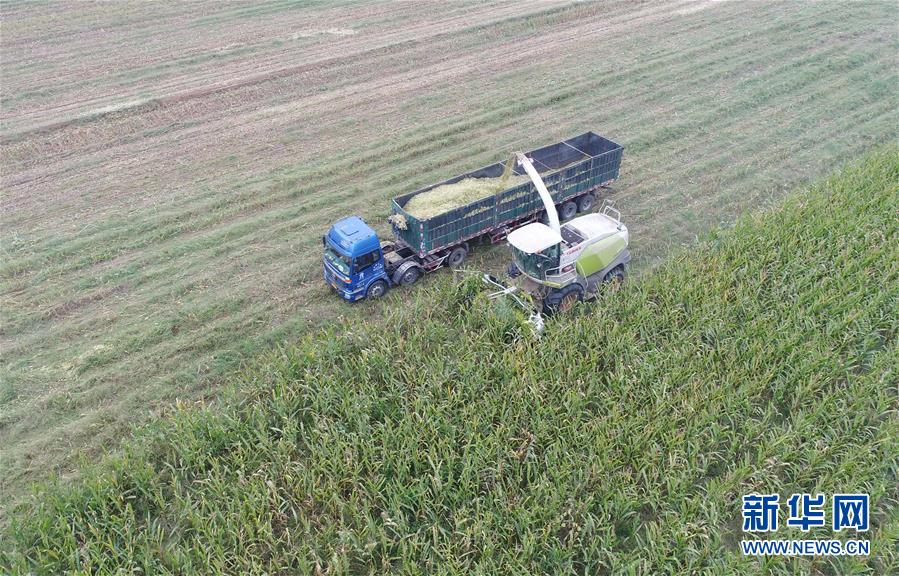 10月8日,河北故城县里老乡林场村农民在收获青贮玉米(无人机拍摄)。 近年来,河北省故城县结合市场需求,通过“龙头企业+基地+农户”的经营模式,鼓励引导农民发展订单式青贮玉米种植,不仅增加了种植户收入,而且为养殖企业提供了优质饲料。目前,故城县已发展青贮玉米种植面积6万余亩。 新华社记者 朱旭东 摄