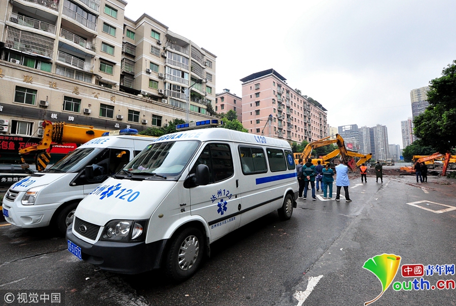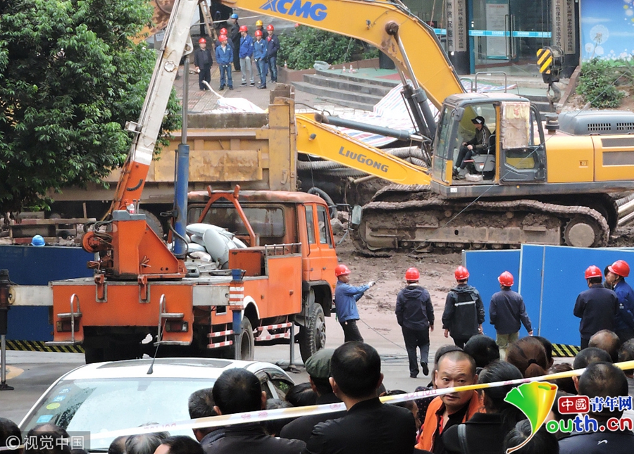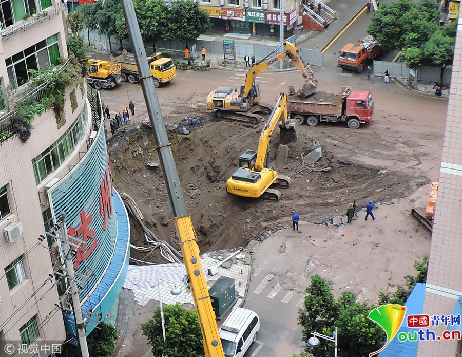 中国青年网北京10月9日电 2018年10月8日消息,四川达州。10月8日从四川省达州市达川区委宣传部获悉,7日14时30分左右,达川区东环南路103号人行道路面发生塌陷险情,经调取视频监控和走访周边群众,救援人员初步判断疑似有4人掉入坑中。图片作者:视觉中国