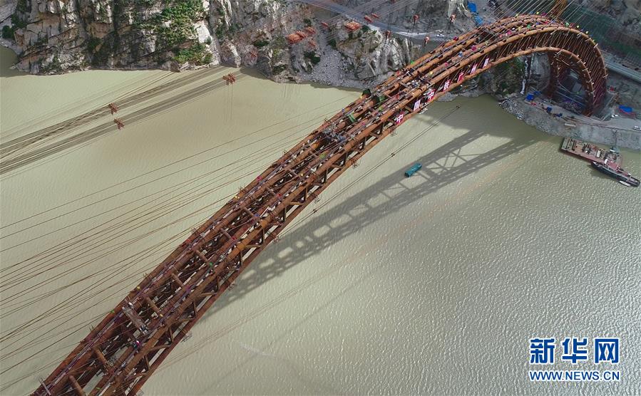 9月28日无人机拍摄的川藏铁路拉林段重点标志性工程藏木特大桥。 当日,随着最后一节钢管拱的对位和锁定完毕,川藏铁路拉林段藏木特大桥成功合龙,标志着大桥主体结构施工取得了关键性胜利。藏木特大桥由中国中铁广州局集团承建,拱高112米,桥横跨雅鲁藏布江峡谷,水深66米。 新华社记者普布扎西摄
