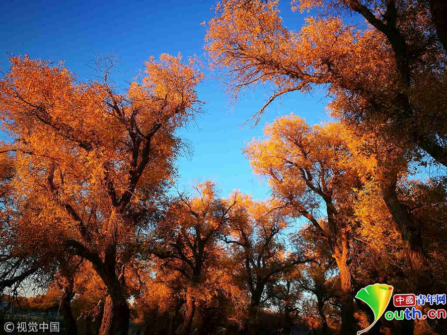大片的胡杨树叶由绿变黄,一眼望去,阳光下金色的树叶衬着湛蓝的天空于风中婆娑起舞。