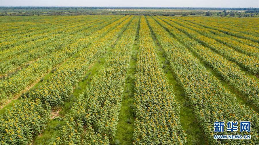 内蒙古达拉特旗白土梁林场的沙棘葵花套种田(8月1日无人机拍摄)。 新华社记者张善臣摄