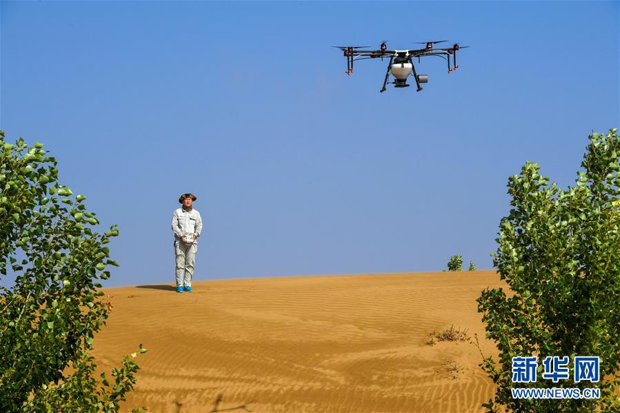 在内蒙古鄂尔多斯市杭锦旗的库布其沙漠中,技术人员操控无人机飞播造林(7月11日摄)。