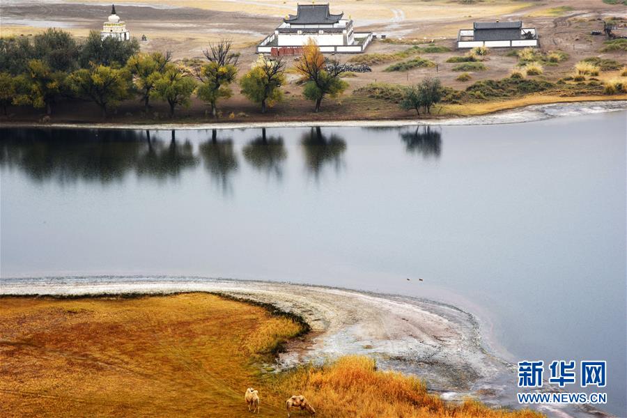 巴丹吉林庙位于名为“庙海子”的湖泊旁(10月19日摄)。 巴丹吉林沙漠位于内蒙古西部阿拉善盟,是中国第三大沙漠,沙丘起伏的曲线陡变成高耸的沙山,碧蓝的湖泊散落在沙海间。 新华社记者 李仁虎 摄