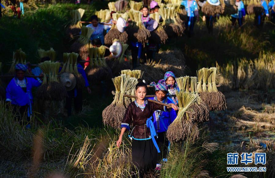 10月30日,在广西融水苗族自治县安太乡元宝村,村民挑着香糯走在田间。 新华社记者 黄孝邦 摄