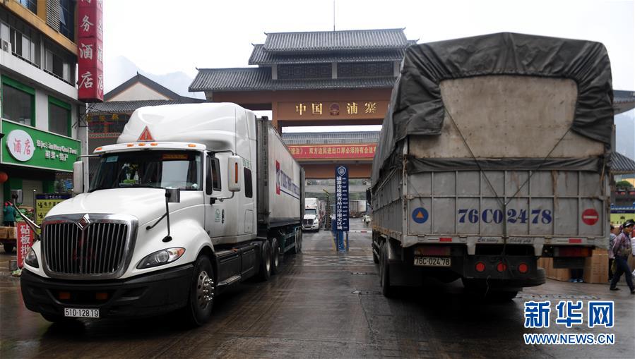 在广西凭祥市浦寨边贸区,东盟国家的货车进出运货(1月16日摄)。新华社记者 张爱林 摄