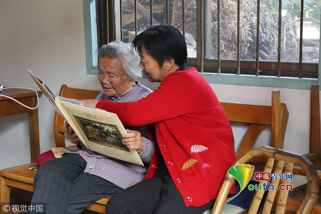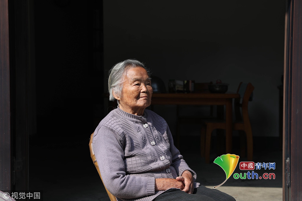 2018年10月31日,杭州,著名作家金庸的妹妹查良琇在浙江临安家中翻看照片。