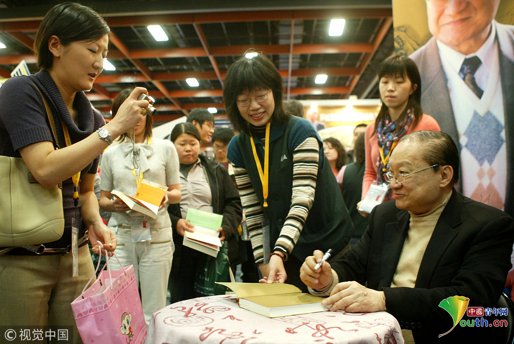 2007年2月2日上午,台湾,武侠小说大师金庸现身台北国际书展为书迷签名,许多读者除了拿小说来签名外,还带着相机来拍照。图片作者:联合知识库