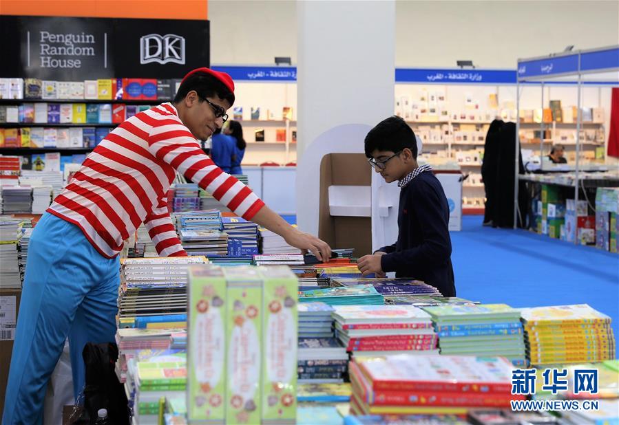 11月14日,在科威特国际展览中心,工作人员(左)向一个男孩介绍图书。 第43届科威特国际书展14日在科威特国际展览中心开幕,共有来自26个国家和地区的505家出版机构参展。 新华社记者 聂云鹏 摄