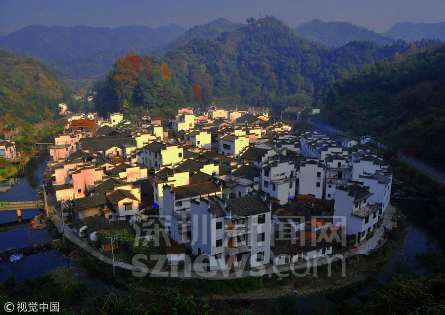小河呈大半圆形,绕村庄将近一周,四周高山环绕,新修的柏油公路沿着河流呈圆弧形绕村而过,一些木板桥与公路相连。