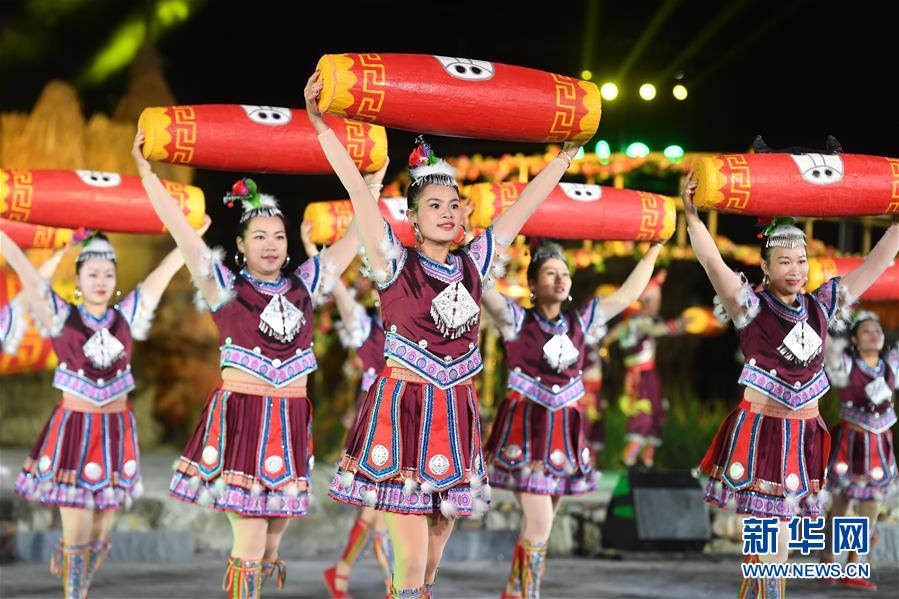 11月21日,演员表演舞蹈《天鼓神韵》。 当日,广西柳州市第一届旅游产业发展大会暨2018第十八届中国·融水苗族芦笙斗马节开幕式晚会在融水苗族自治县举行。 新华社记者 周华 摄