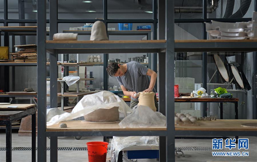 在江西景德镇陶溪川文创街区的国际工作室,一位来自美国的艺术家在制作陶瓷艺术品(2016年10月20日摄)。 新华社记者 万象 摄
