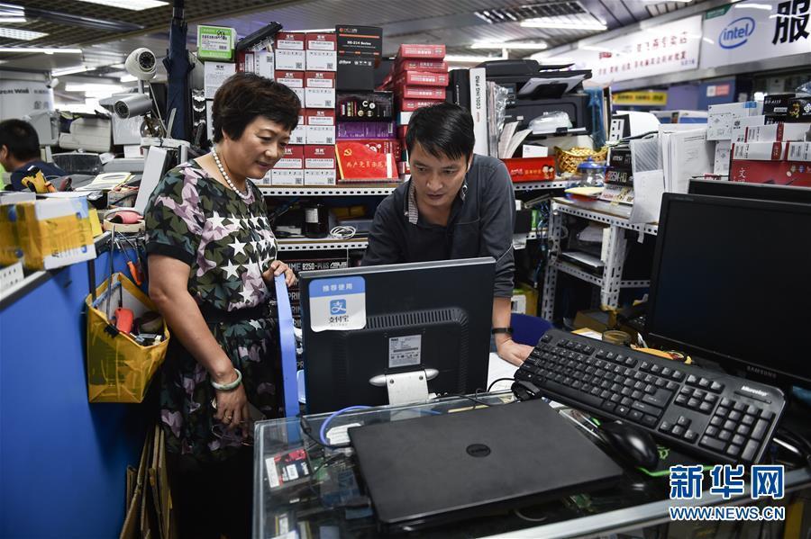 倪海真(左)到深圳华强北赛格电子市场五层的支部宣传委员陈亚林柜台前,与他沟通近期支部党员学习的情况(2017年9月5日摄)。新华社记者毛思倩 摄 图片来源:新华网
