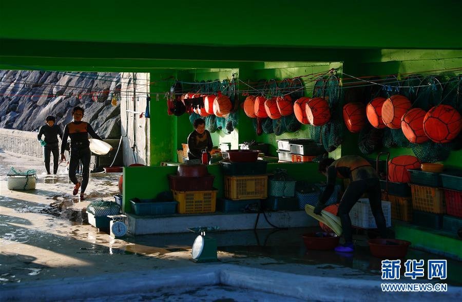 11月23日,海女们在韩国济州岛的一处海岸附近处理打捞出的海产品。新华社记者王婧嫱摄