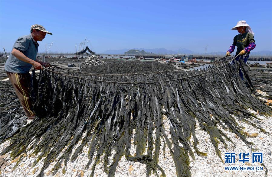 5月17日,在霞浦县沙江镇沙江村码头,养殖户在晾晒海带。