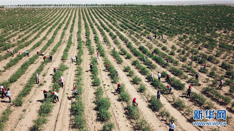 红寺堡生态移民区的移民在百瑞源枸杞种植基地采摘头茬枸杞(5月30日无人机拍摄)。近日,在宁夏吴忠市红寺堡区百瑞源枸杞种植基地,头茬枸杞迎来采摘收获季。今年头茬枸杞采摘期比往年提前20天左右。据了解,该基地地处红寺堡生态移民区,占地3000亩,采摘季节每天有数百名当地移民在田间采摘劳作。新华社记者王鹏 摄