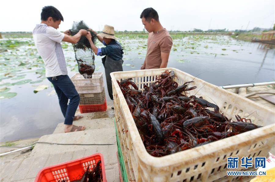 5月23日,在南昌市新建区象山镇河林村,当地农户将捕获的小龙虾搬运上岸装箱。近日,江西省南昌市新建区1.7万亩水域养殖小龙虾喜获丰收,当地农户纷纷将鲜活的小龙虾捕获上岸,装箱外销。据了解,近年来,南昌市新建区发挥辖区内河道纵横,水田众多的优势,支持鼓励农户发展小龙虾养殖业,为当地农户开辟了一条特色养殖的致富之路。新华社记者彭昭之 摄