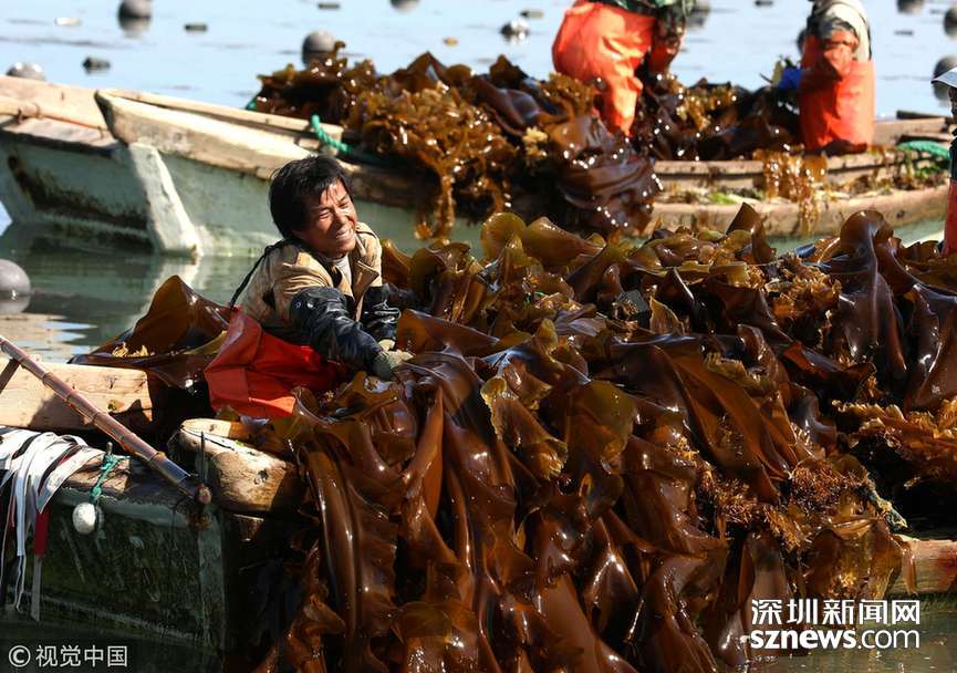 深圳新闻网讯 2018年5月26日,在山东省荣成市一海上养殖区,工人们正在收割海带。