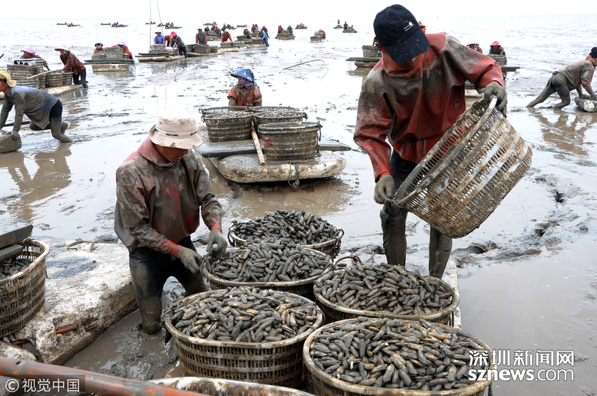2018年5月30日,渔民们在江苏连云港沿海地区海边的滩涂上将刚收获的海蛏运送上岸装箱外运。