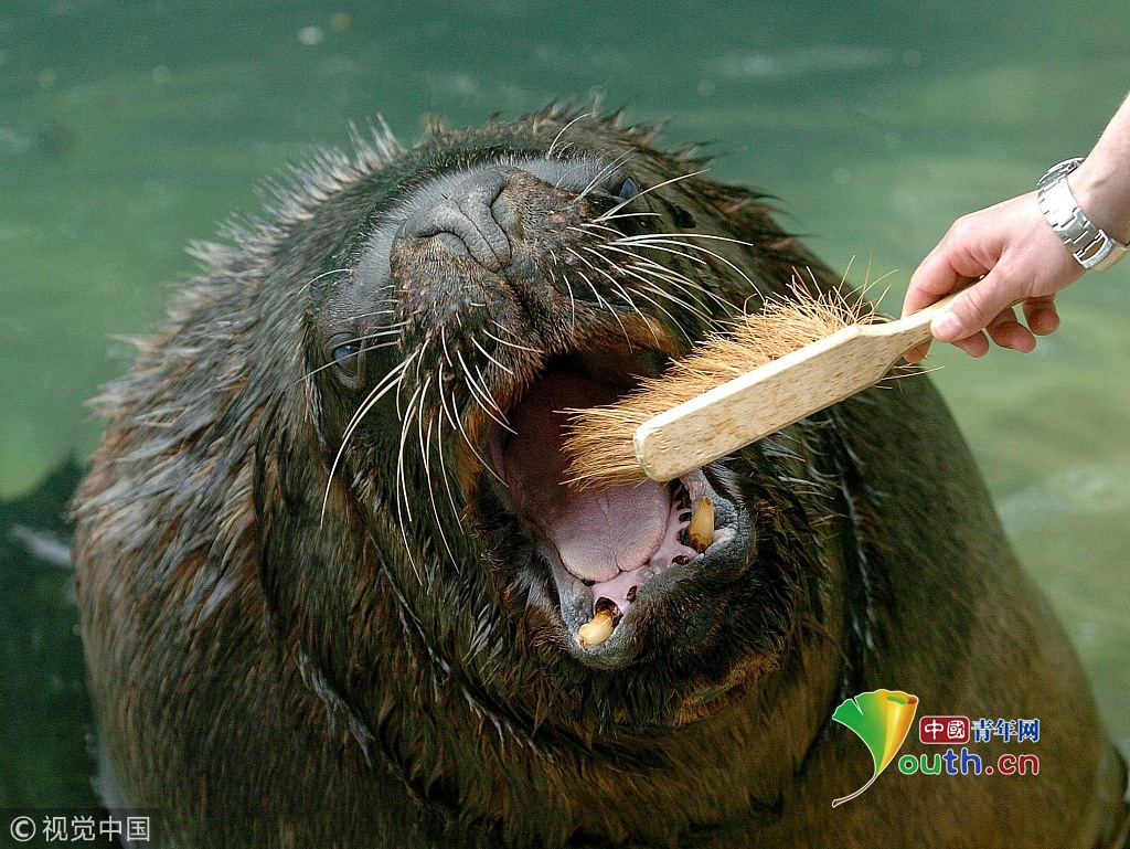 2006年5月18日,英国城市达德利,一只十四岁的海狮奥利尔在动物园里接受饲养员的护理。奥利尔体重达四百千克,每次进餐后饲养员要给奥利尔刷牙,每月进行一次牙科卫生检查。