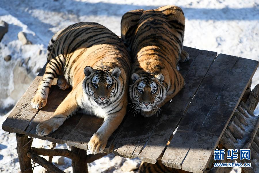 在横道河子东北虎林园散放区,两只东北虎在木架子上休息(11月21日摄)。新华社记者王建威摄