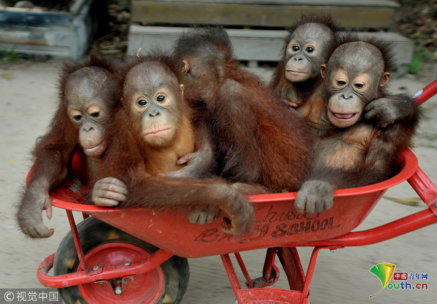 印尼动物救援中心里 猩猩宝宝挤“校车”“上学”超萌