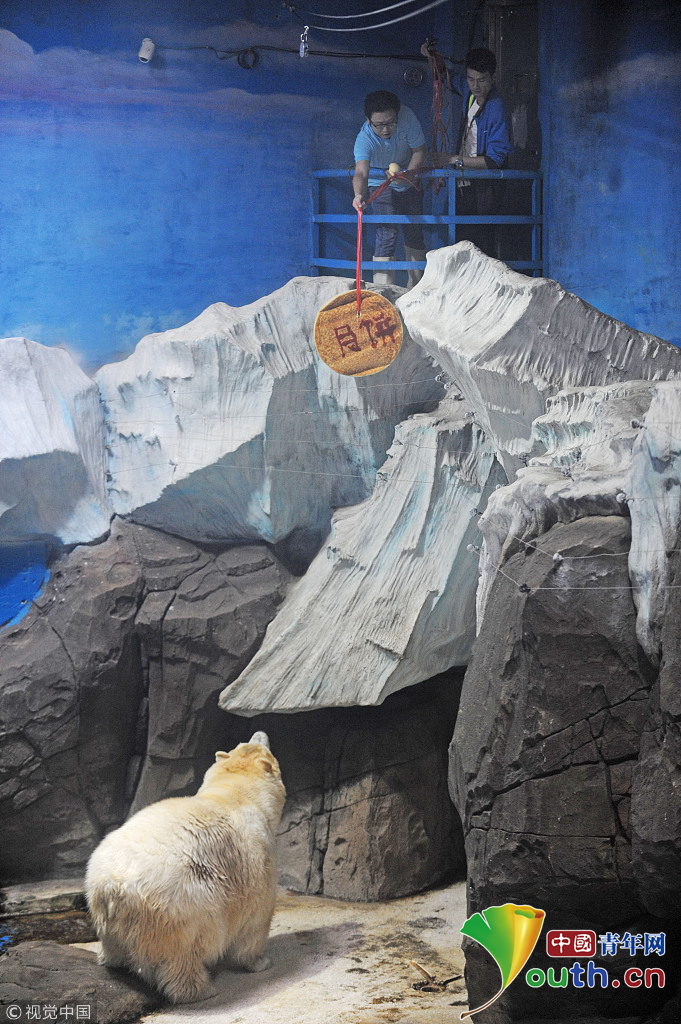 2017年9月29日,武汉海昌极地海洋公园里,北极熊“静静”翘首以盼为自己准备的“专属月饼”。