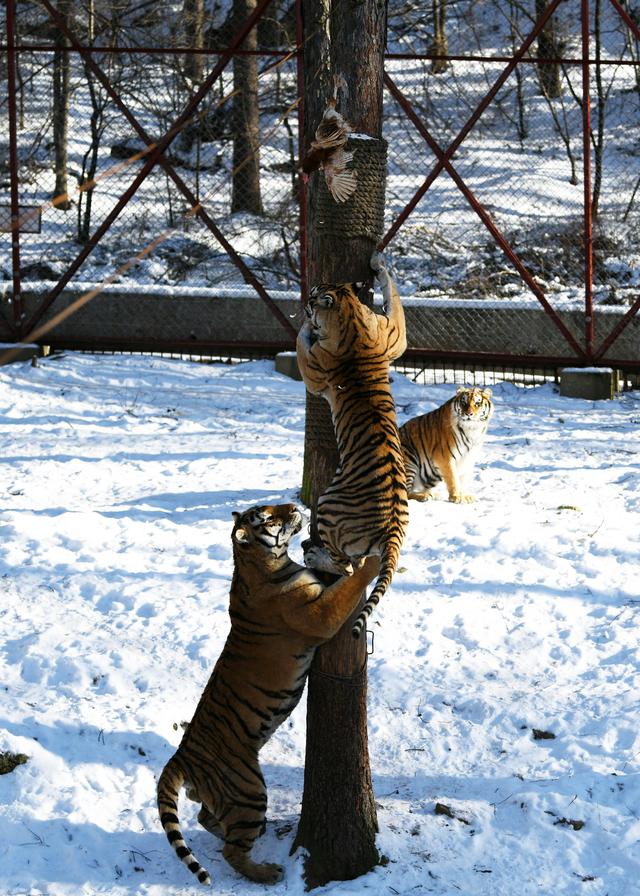 在黑龙江省海林市的横道河子东北虎林园的散放区,这里的东北虎可以轻松爬上5米高的树干去捕食工作人员投放在那里的活鸡。据介绍,园区东北虎雌虎平均体重约为150公斤,雄虎平均体重200公斤以上。能爬树的东北虎体型不能太大,所以身材娇小的雌虎更有优势。横道河子东北虎林园目前有东北虎400余只,其中近200只处于散放状态。