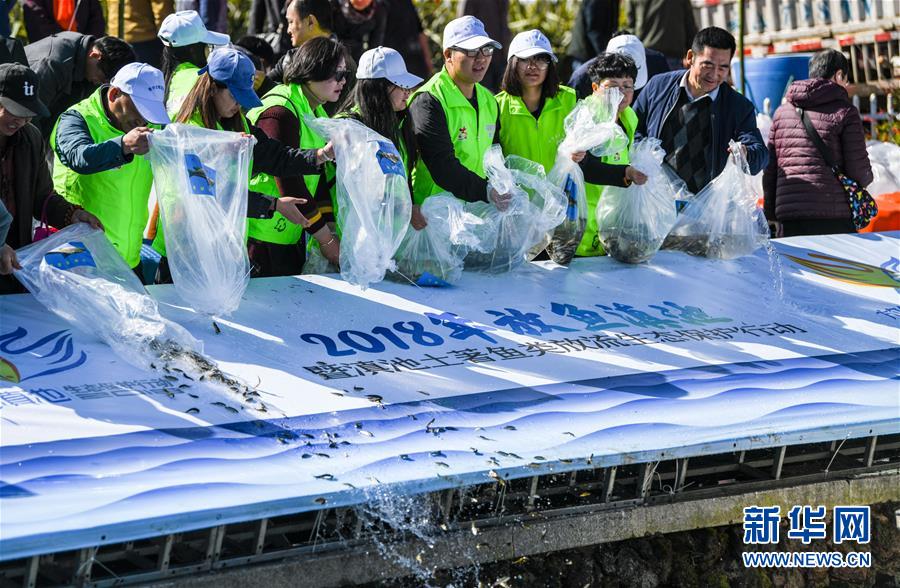 11月23日,志愿者们在滇池湖畔放鱼。新华社记者江文耀摄