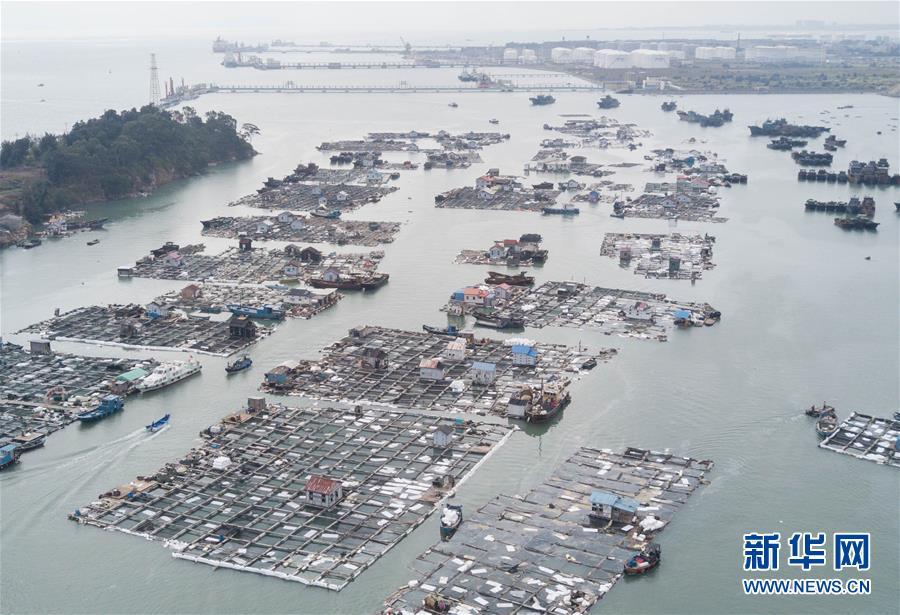 这是发生碳九泄漏事件的福建省泉州市泉港区南埔镇肖厝村附近海域,渔排上铺设了吸油毡(11月6日无人机拍摄)。