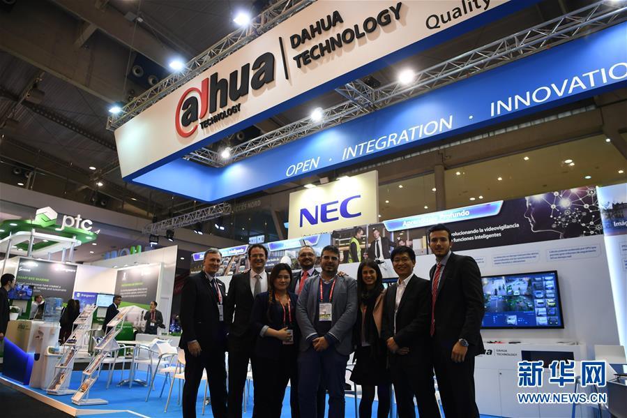 2017年11月15日,在巴塞罗那2017全球智慧城市博览会上,浙江大华技术股份有限公司的中外员工在本公司展台前合影。新华社记者郭求达摄