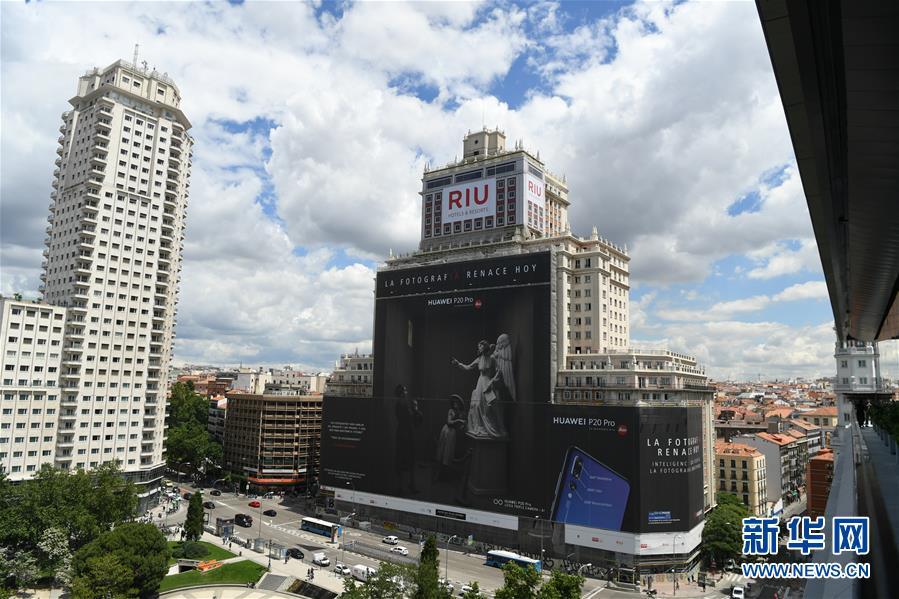 2018年6月12日,位于马德里市中心的西班牙大厦挂出华为P20 Pro手机超大幅广告。新华社记者郭求达摄