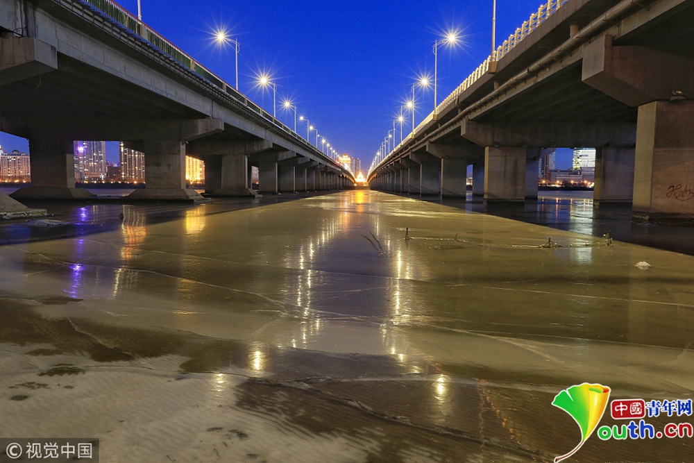 松花江封江 冰面如镜倒影冰城夜景