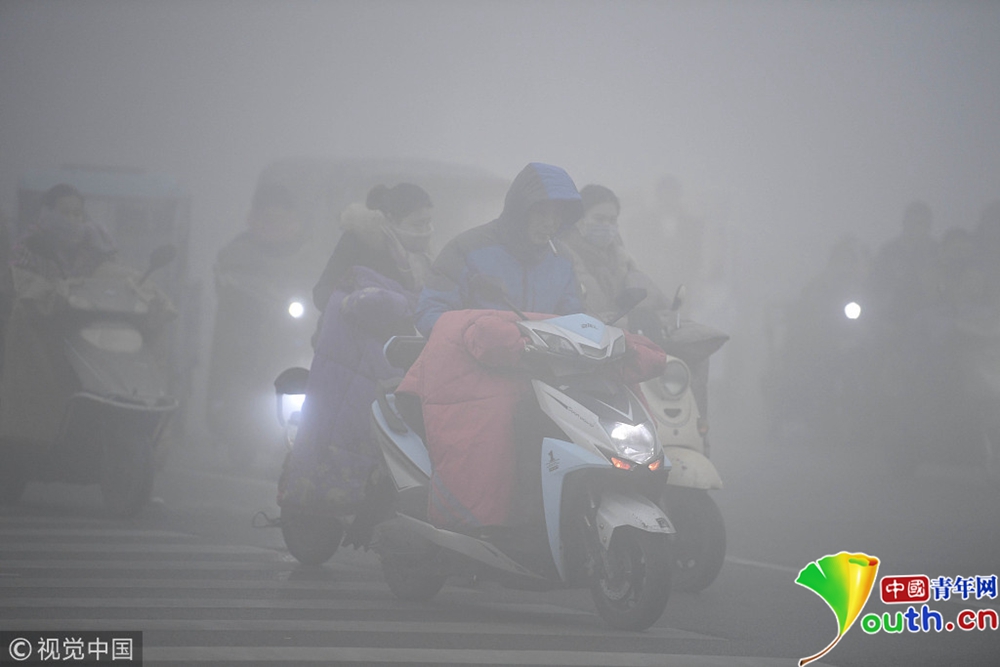 2018年11月26日,全国多地出现大雾天气。安徽亳州,市民在大雾弥漫的街头出行。