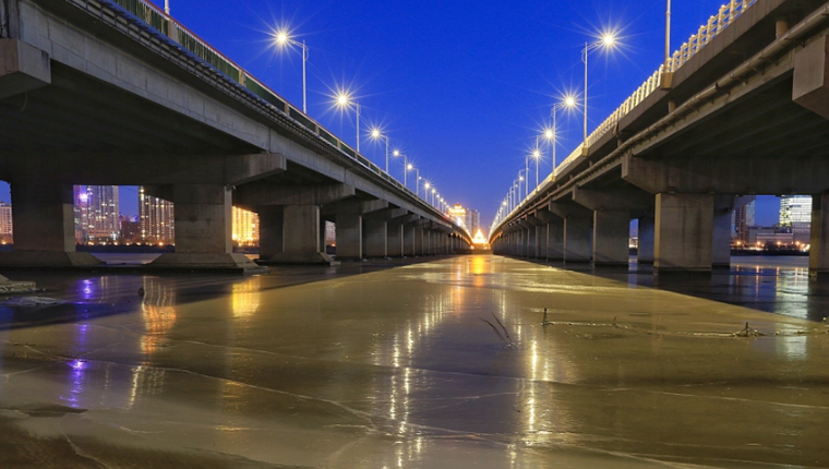 松花江封江 冰面如镜倒影冰城夜景