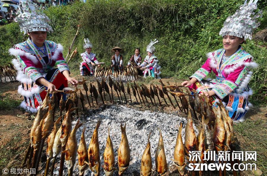 深圳新闻网讯 2018年9月15日,广西柳州市融水苗族自治县喜迎中国首届“农民丰收节”——2018金秋烧鱼季启动仪式在杆洞乡花孖苗寨举行,数百名苗族群众和游人共同开展了水田拔河、田间捉鱼、传统打谷和烧鱼等活动,庆祝丰收。