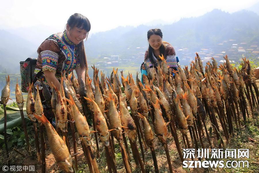 广西柳州市融水县山区有插秧时节放养鲤鱼苗的习俗,金秋时节稻熟鱼肥,收稻烧鱼成为别致一景。