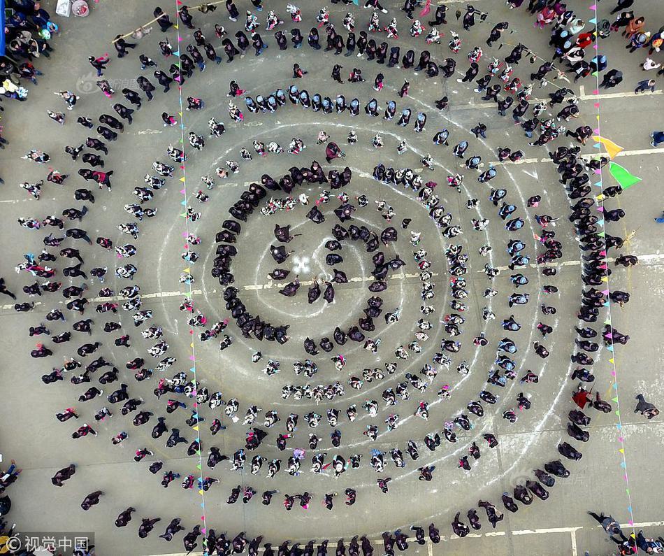 11月20日报道,2018年11月19日,侗族同胞在参加贵州省从江县庆云镇“冻鱼节”踩歌堂。(无人机拍摄)2018年11月19日,贵州省从江县庆云镇境内的石姓侗族同胞迎来传统一年一度的“冻鱼节”,当地侗族同胞身着节日盛装举行祭萨、踩歌堂、赛侗歌,庆祝丰收,祈福来年风调雨顺,五谷丰登。