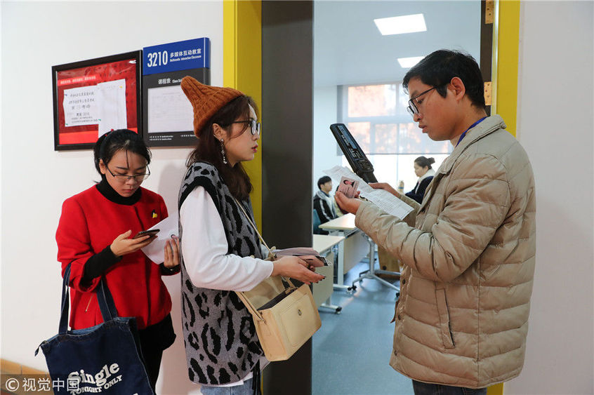 2018年12月02日,江苏省南京市,考生在南京林业大学考点看考场分布。姚家/视觉中国