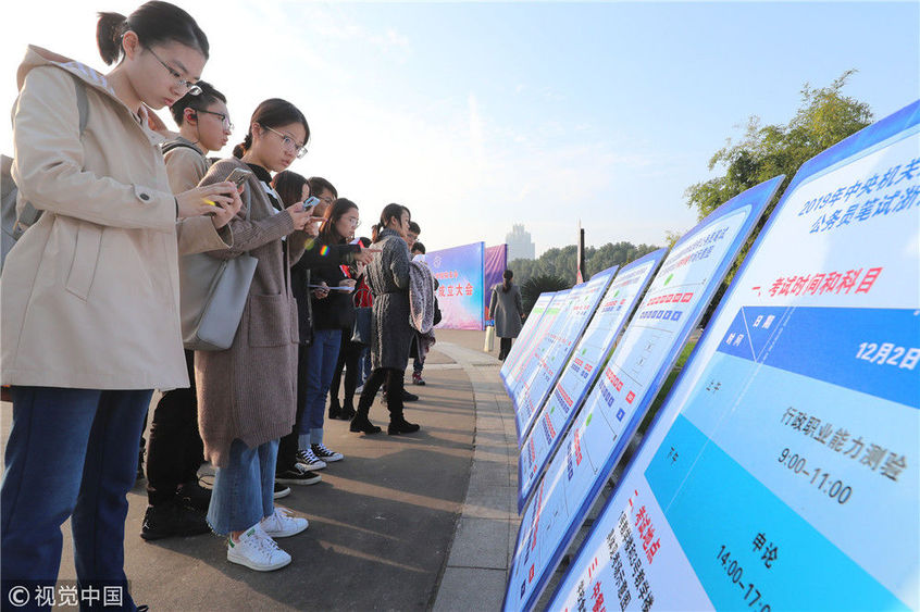 2018年12月2日,北京,参加2019年度中央机关及其直属机构公务员招考笔试的考生走入首都经济贸易大学考点准备考试,步履匆匆。2019年度中央机关及其直属机构公务员招考笔试今日开考。本次国考计划招录1.45万人,共有137.93万人通过报名资格审查,平均竞争比达到95:1,为近5年来最高,最热岗位的竞争超过4000:1。视觉中国