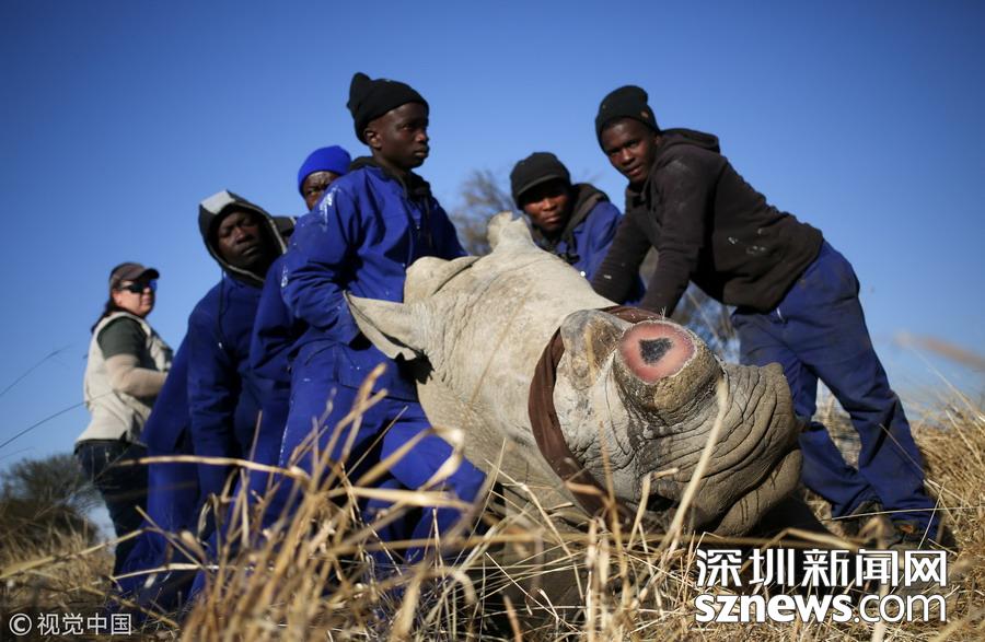 当地时间2017年8月14日,南非西北省,一名工作人员在为一头犀牛锯角,这是一种保护犀牛的行为,可以防止它们丧命于偷猎者的枪口下。