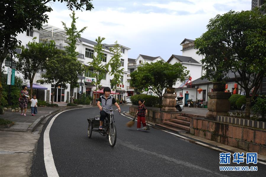 下姜村村民在村庄里骑行(2017年8月9日摄)。
