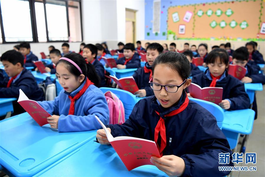 12月3日,合肥市朝霞小学的学生们在诵读宪法。国家宪法日到来之际,各地学校纷纷举办主题宣讲活动,对学生开展法治教育,帮助孩子们了解宪法知识。新华社记者 刘军喜 摄