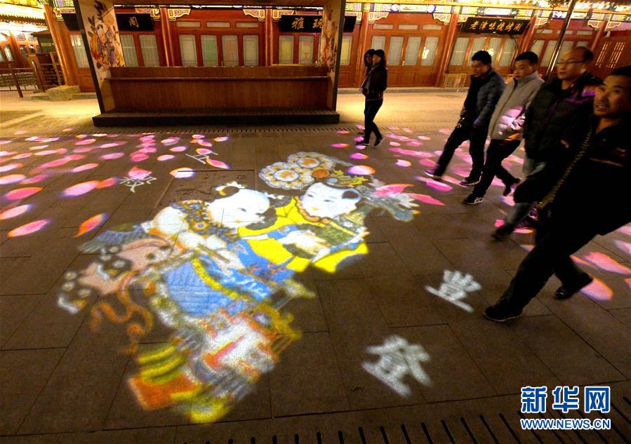 12月4日,杨柳青年画主题灯光布满古镇步行街。 近日,天津市西青区杨柳青古镇在步行街新增9组以杨柳青年画代表作为主题的动态夜景灯光,讲述古镇与年画的历史。 新华社记者 岳月伟 摄