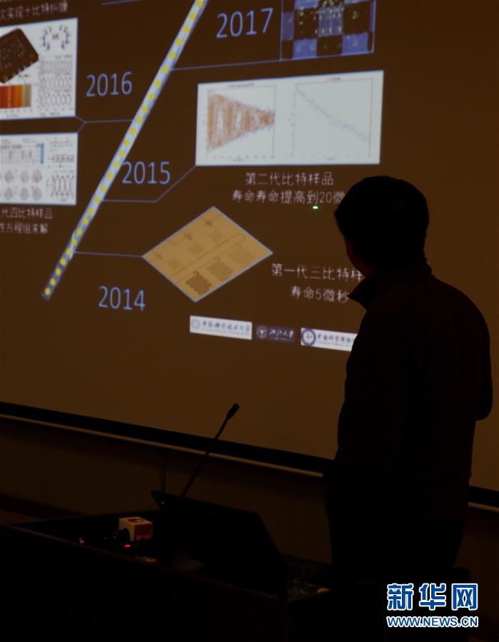 2017年5月3日,中国科学技术大学潘建伟院士在上海宣布,我国科研团队成功构建的光量子计算机,首次演示了超越早期经典计算机的量子计算能力。这是潘建伟院士在介绍“超导量子计算机路线图”。 新华社记者 金立旺摄