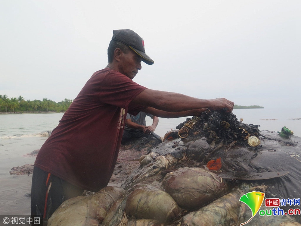 当地时间2018年11月19日,印尼瓦卡托比,当地发现一头搁浅的鲸,肚子里满是塑料垃圾。它的腹中有12斤塑料垃圾,其中包括115个杯子。