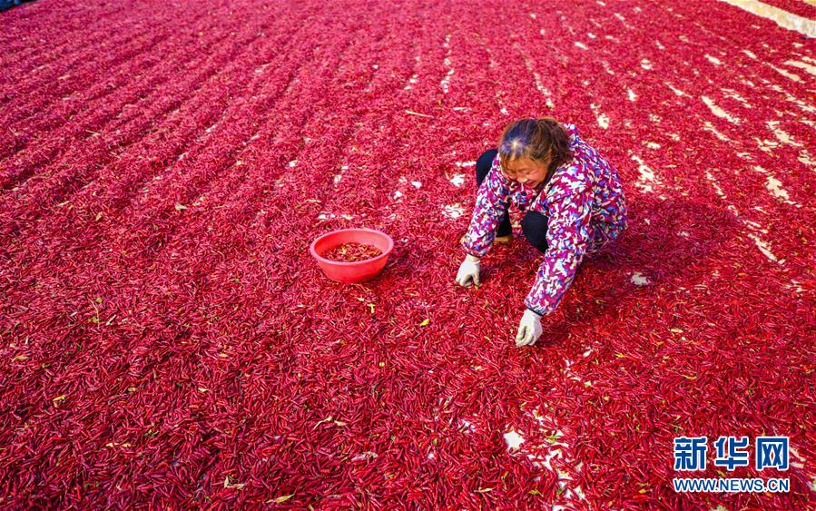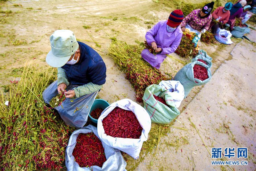 11月18日,在衡水市冀州区周村镇辣椒加工交易基地,椒农在摘辣椒。